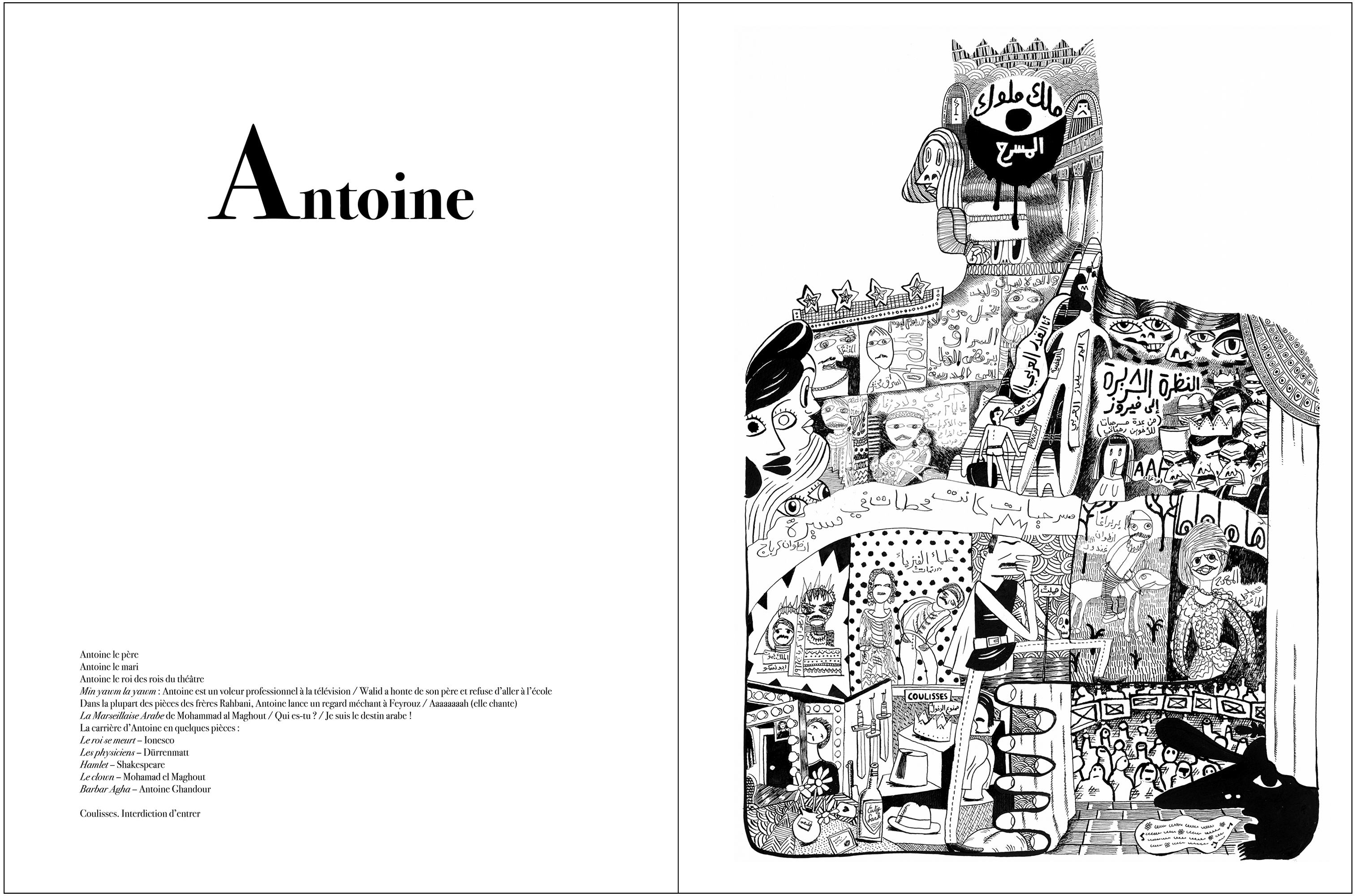 How do you create a two-man autobiography? Do you reveal only the moments shared in common? Do you bring together all the richness of two lifetimes, the incomparable perspectives of two people, and offer them up as one? In “L’Abecedaire” (Primer), artists Laure Ghorayeb and Mazen Kerbaj are exhibiting an alphabetized series of 26 collaborative black-and-white drawings that aim to explore the possibilities of a dual autobiography. Each piece was worked on by both artists, their distinct but harmonious styles blending together to create a uniform aesthetic that runs throughout the series.