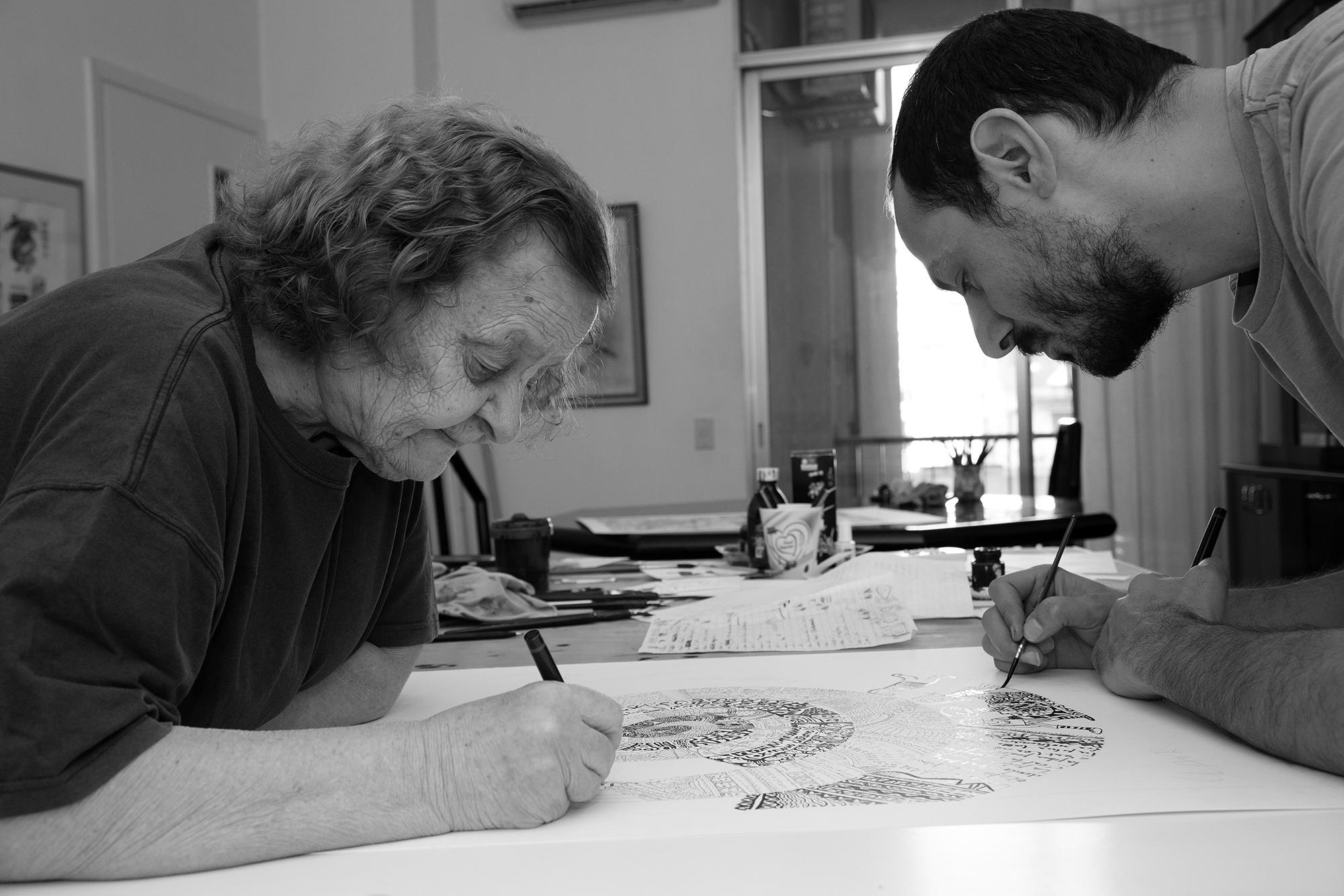 Ils forment le tandem le plus émouvant de la scène artistique libanaise. Le plus improbable et le plus naturel aussi. Laure Ghorayeb, la mère, 83ans, et Mazen Kerbaj, le fils, 39 ans. Aussi différents physiquement que le jour et la nuit. Elle : petite, extravertie, solaire, bouille ronde et crinière de lionne ébouriffée. Lui : grand, maigre, sombre, yeux noirs, cheveux noirs, barbe noire. Mais en commun, un même tempérament de feu qui les pousse à s’affronter, se mesurer, se défier... à travers, notamment, leur passion commune pour le trait graphique.
