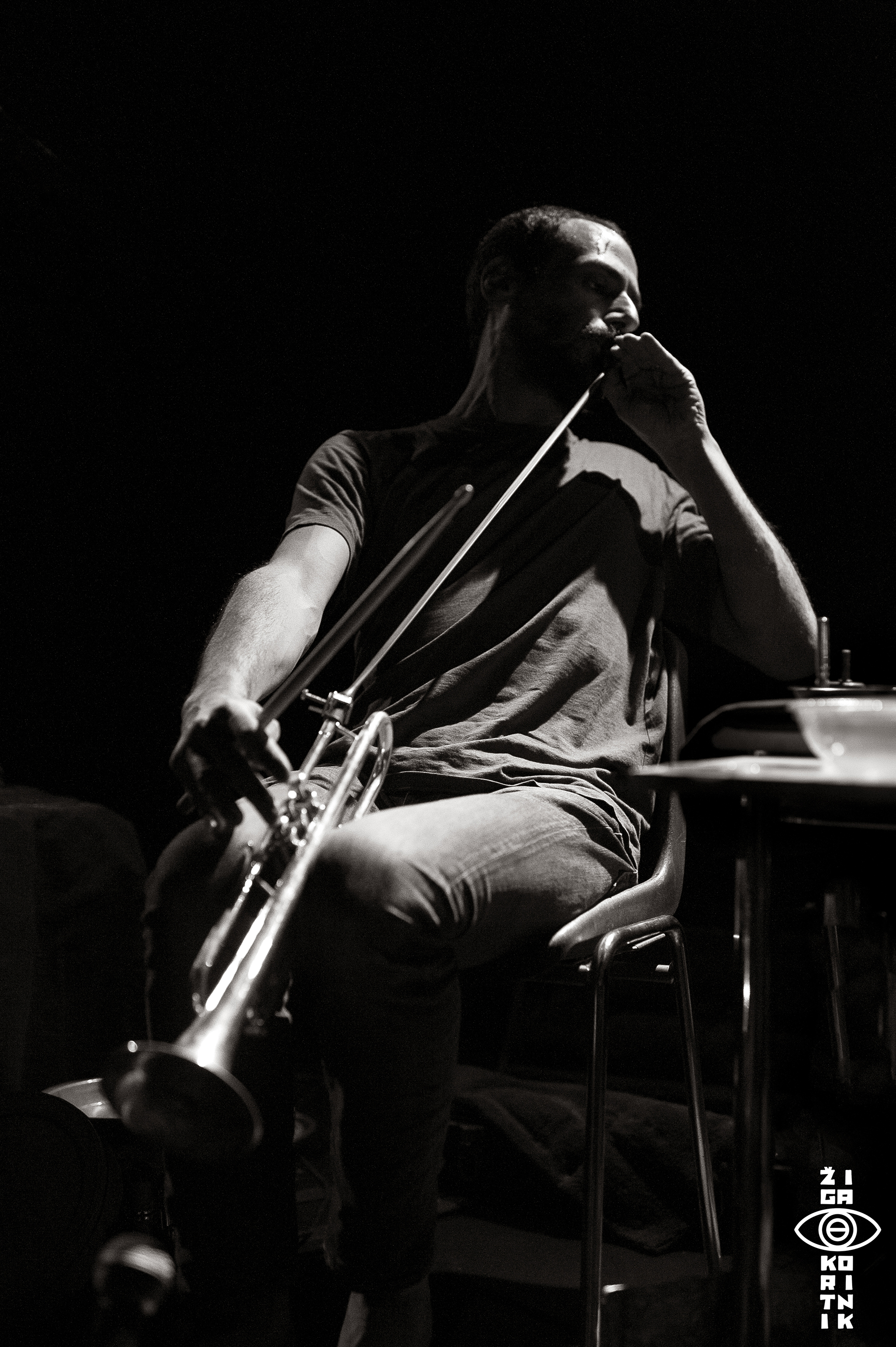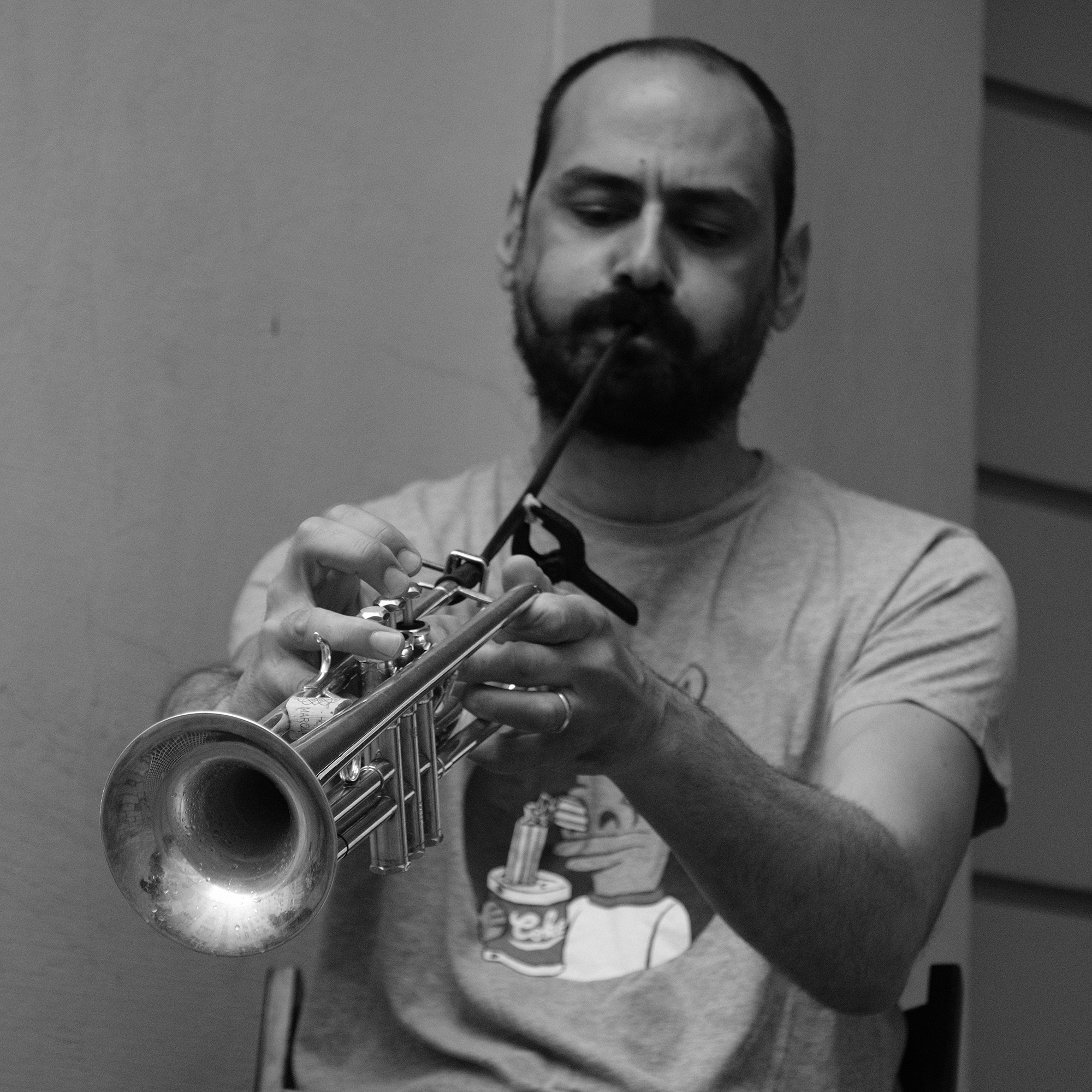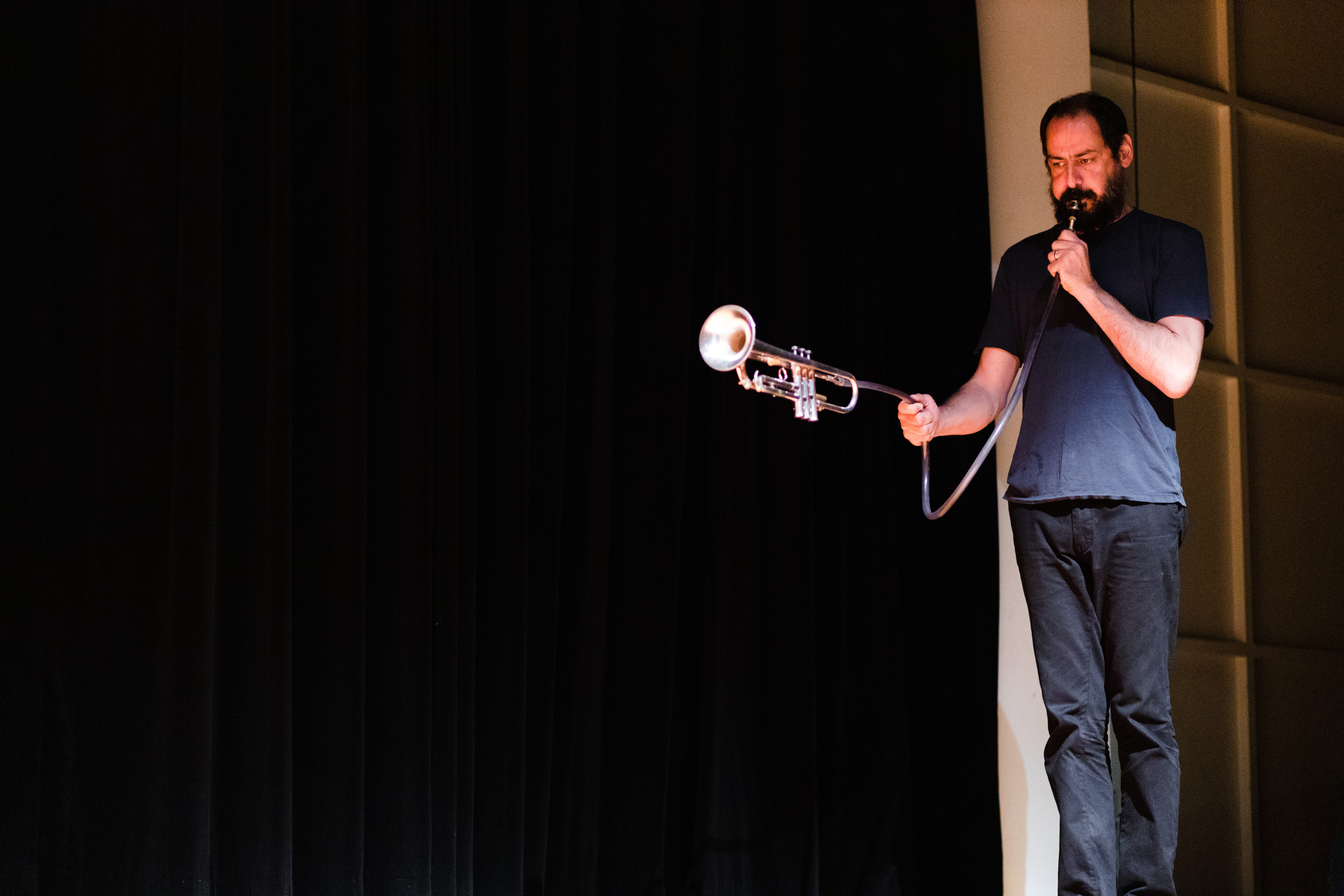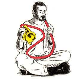 Playing in solo has always been an important part of Mazen Kerbaj’s musical journey; it is in this bare-bones setup that he can experiments the most with his instrument, pushing it beyond any recognition. His use of various every-day objects (tubes, plastic bowls, balloons, aluminium foil…) to “prepare” the trumpet, and his unique playing techniques allow him to create raw soundscapes that sound sometimes like electronics (he himself describes his playing as “electronic music, played acoustically”), especially when he plays several continuous layers of sound at the same time on an instrument that is not designed for that.