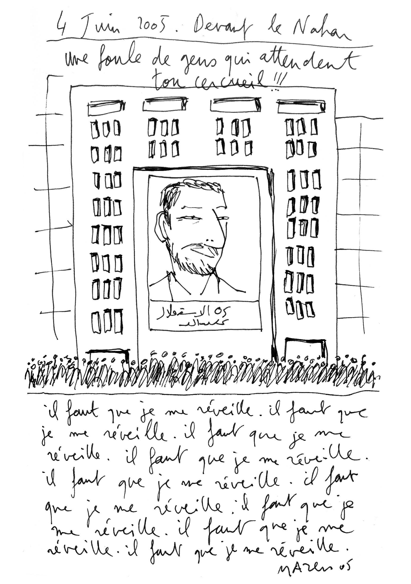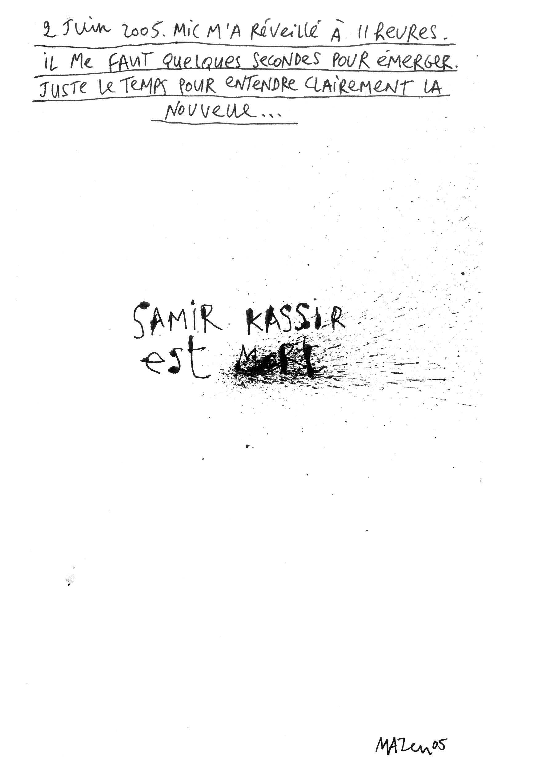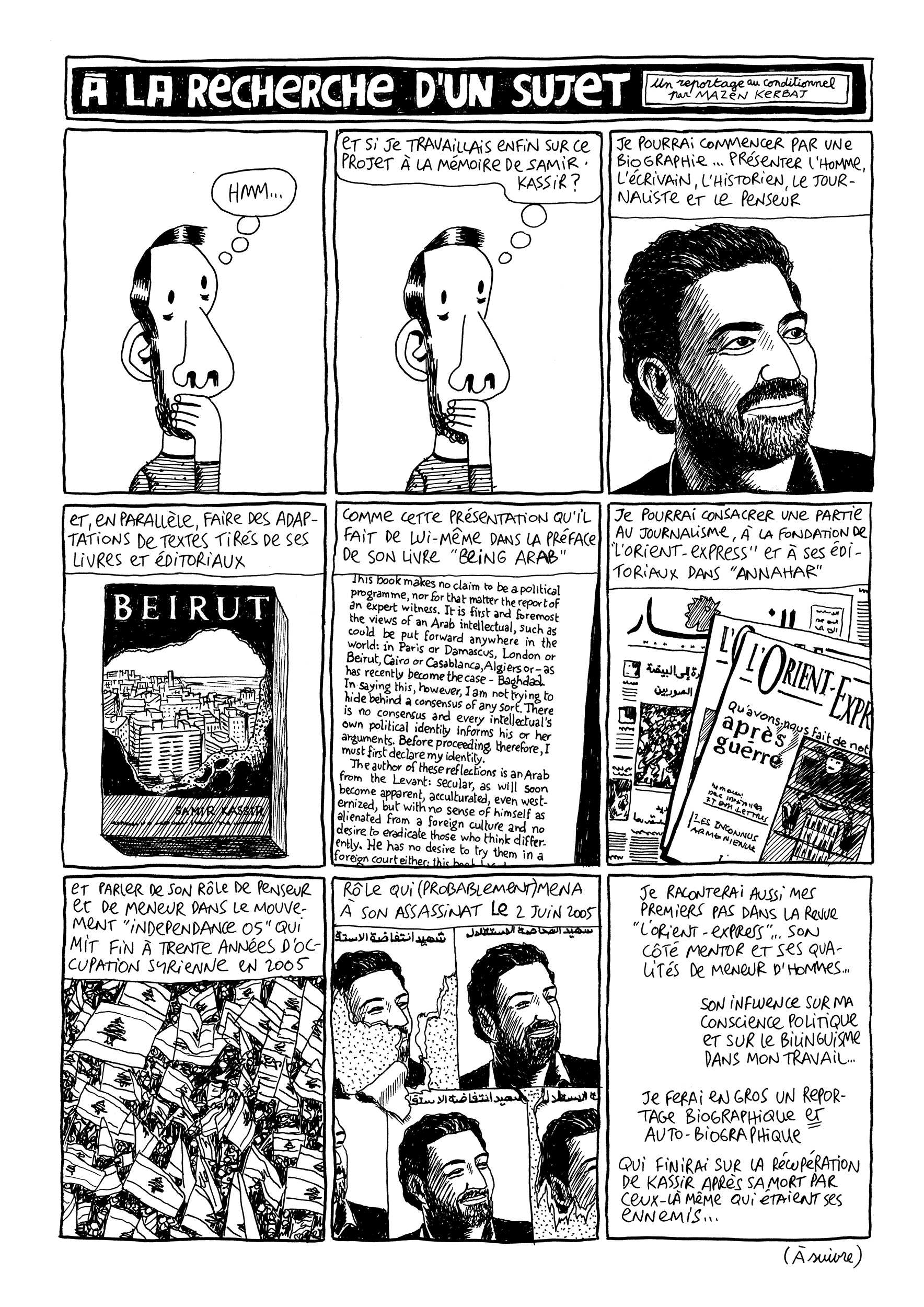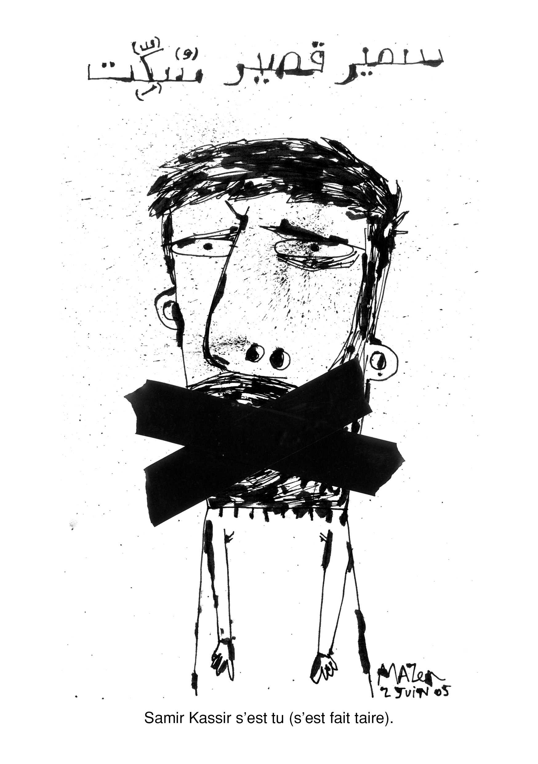 Samir Kassir was a Lebanese historian, writer and journalist. His assassination on July 2, 2005 left a whole generation of Lebanese in a state of shock that is still felt today. Mazen Kerbaj collaborated in the mid-nineties to Kassir's L'Orient-Express, a short lived political and cultural magazine that had a great impact in the aftermath of the civil war.