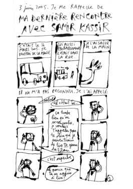 Kerbaj, who considers Kassir as a dear friend and as a mentor, has commemorated the date of the assassination in various drawings and comics pages since, some of which are reproduced below.