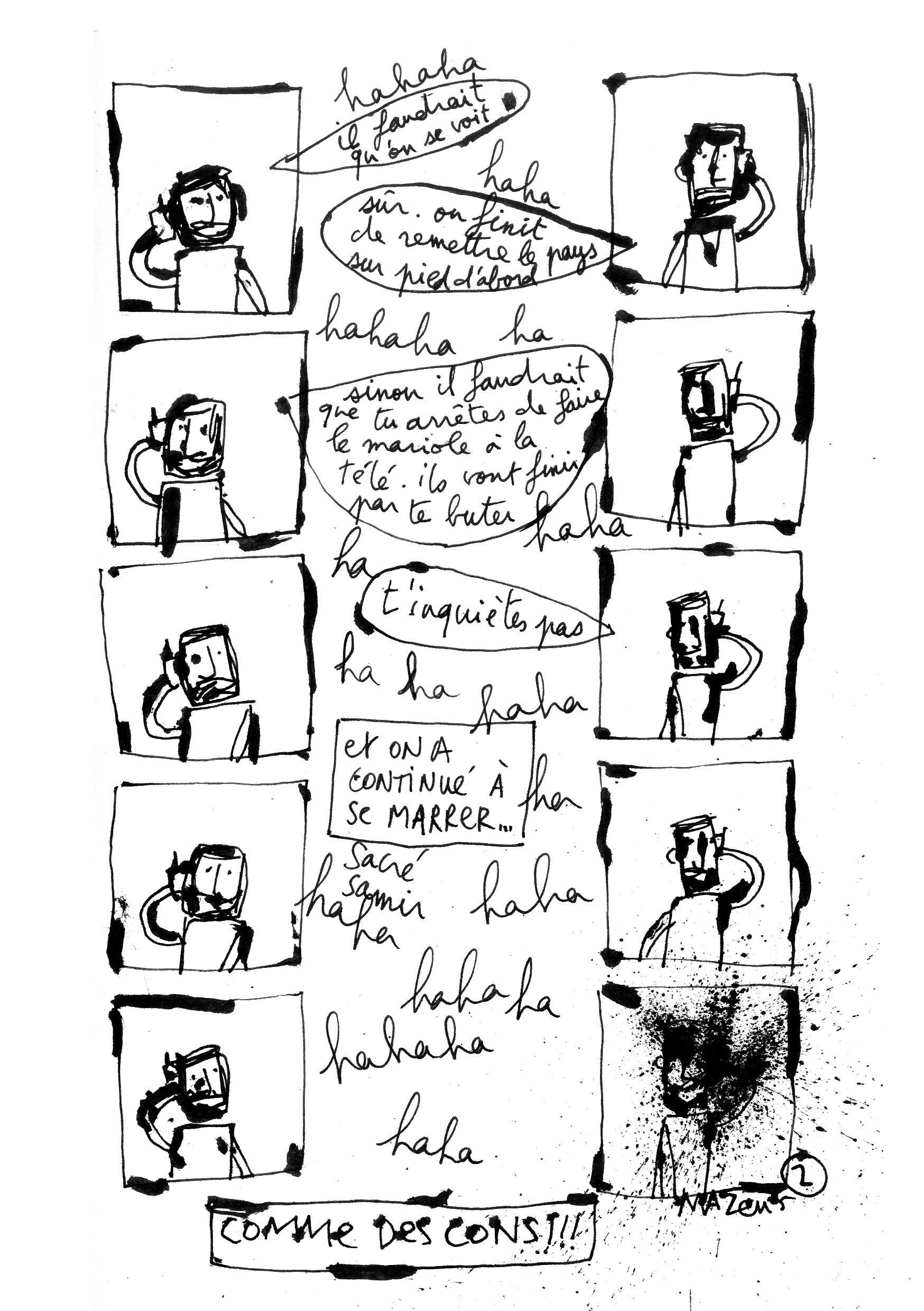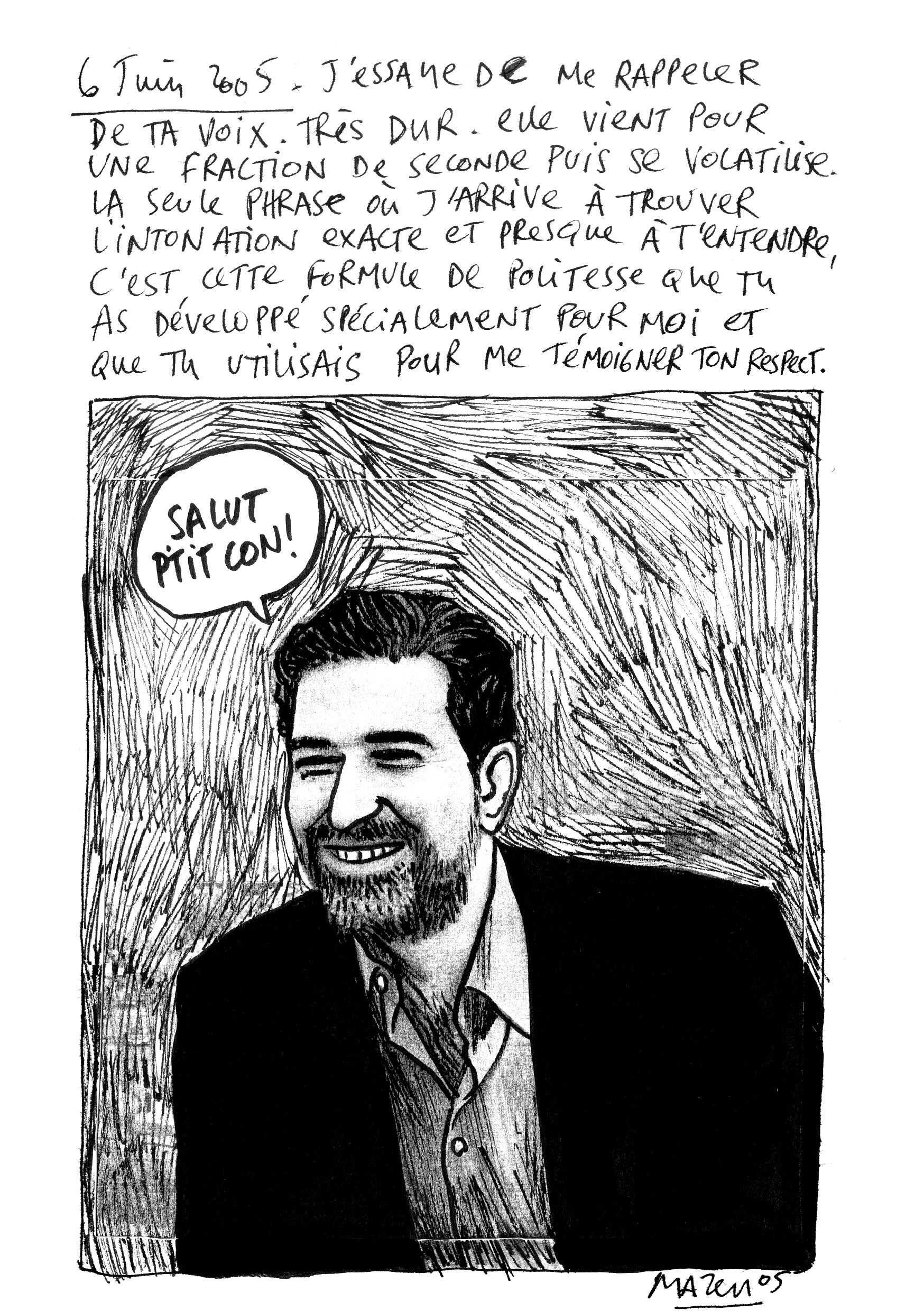 Une semaine sans la voix de Samir est comme son titre l’indique une oeuvre qui a émergée une semaine après l’attentat perpétrée sur Samir Kassir, le 2 juin 2005. Journaliste de gauche, il avait commencé à l’Orient-le-Jour, écrit dans Le Monde Diplomatique, puis fondé le supplément l’Orient-Express dans lequel Mazen Kerbaj a collaboré. Figure de la contestation, sa disparition s’inscrit dans une année noire pour le Liban qui avait vu l’émergence d’un printemps arabe effacé violemment par une série de morts à la voiture piégée. De cette histoire tragique, Mazen Kerbaj a voulu témoigner de son attachement à l’homme, à l’ami. Le deuil a ici une temporalité: le jour de la nouvelle et la semaine qui s’ensuit. Mazen Kerbaj raconte ainsi tous les sentiments qui le traversent: le moment de la nouvelle, les souvenirs, l’enterrement, mais aussi sa condition identitaire.
