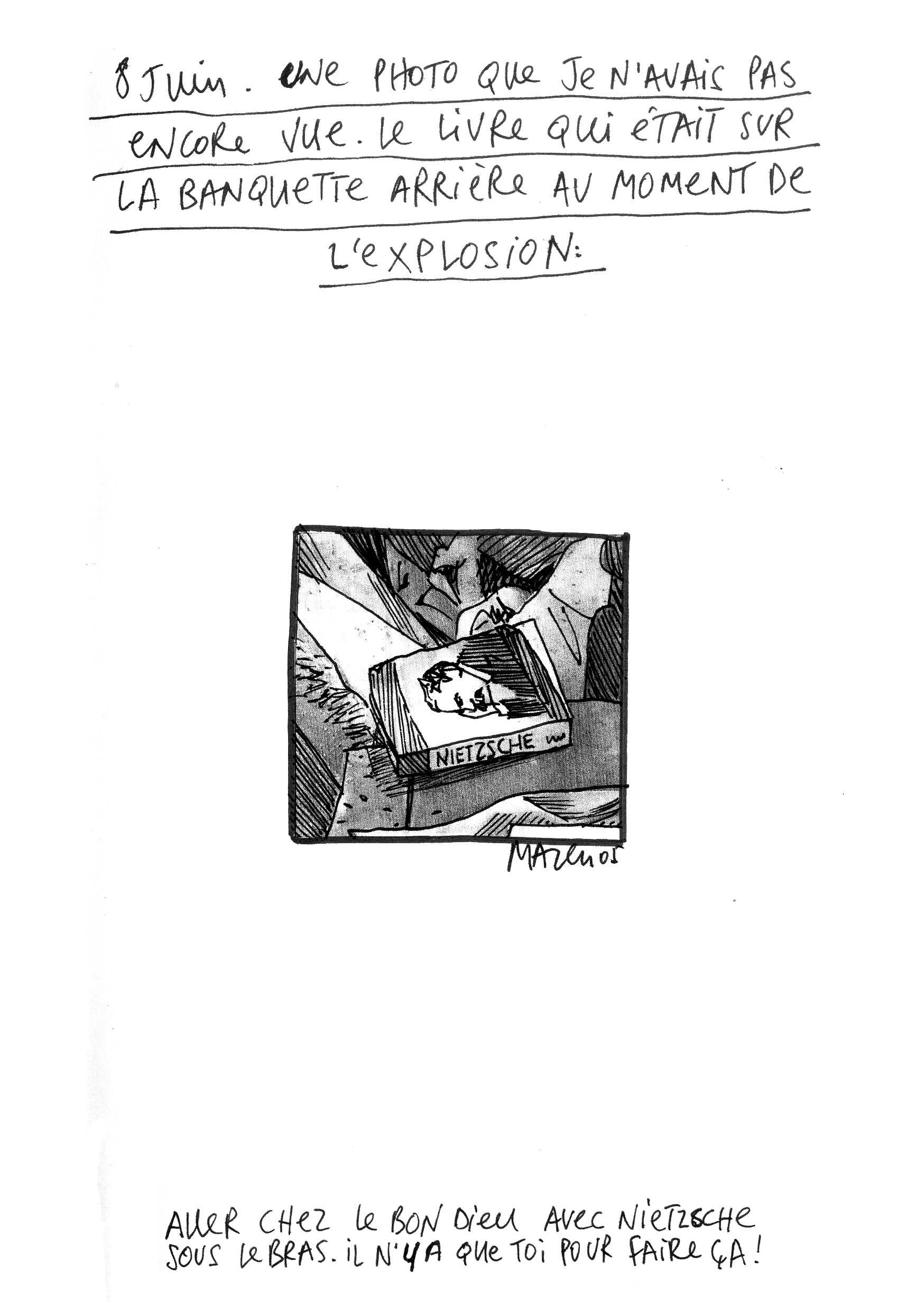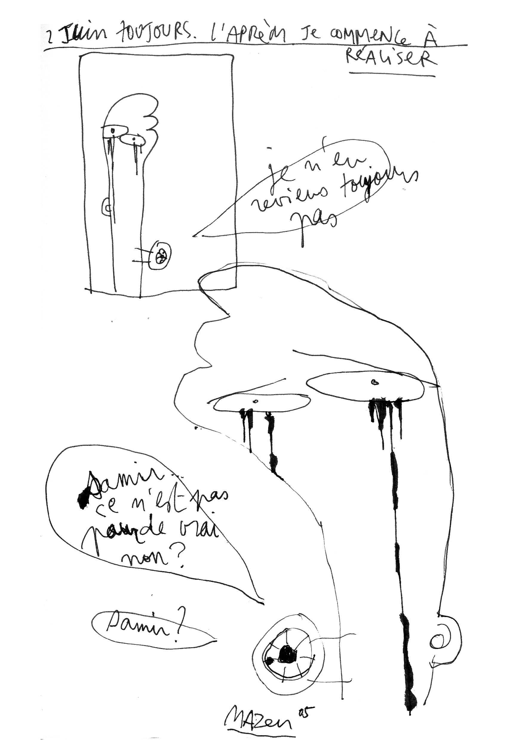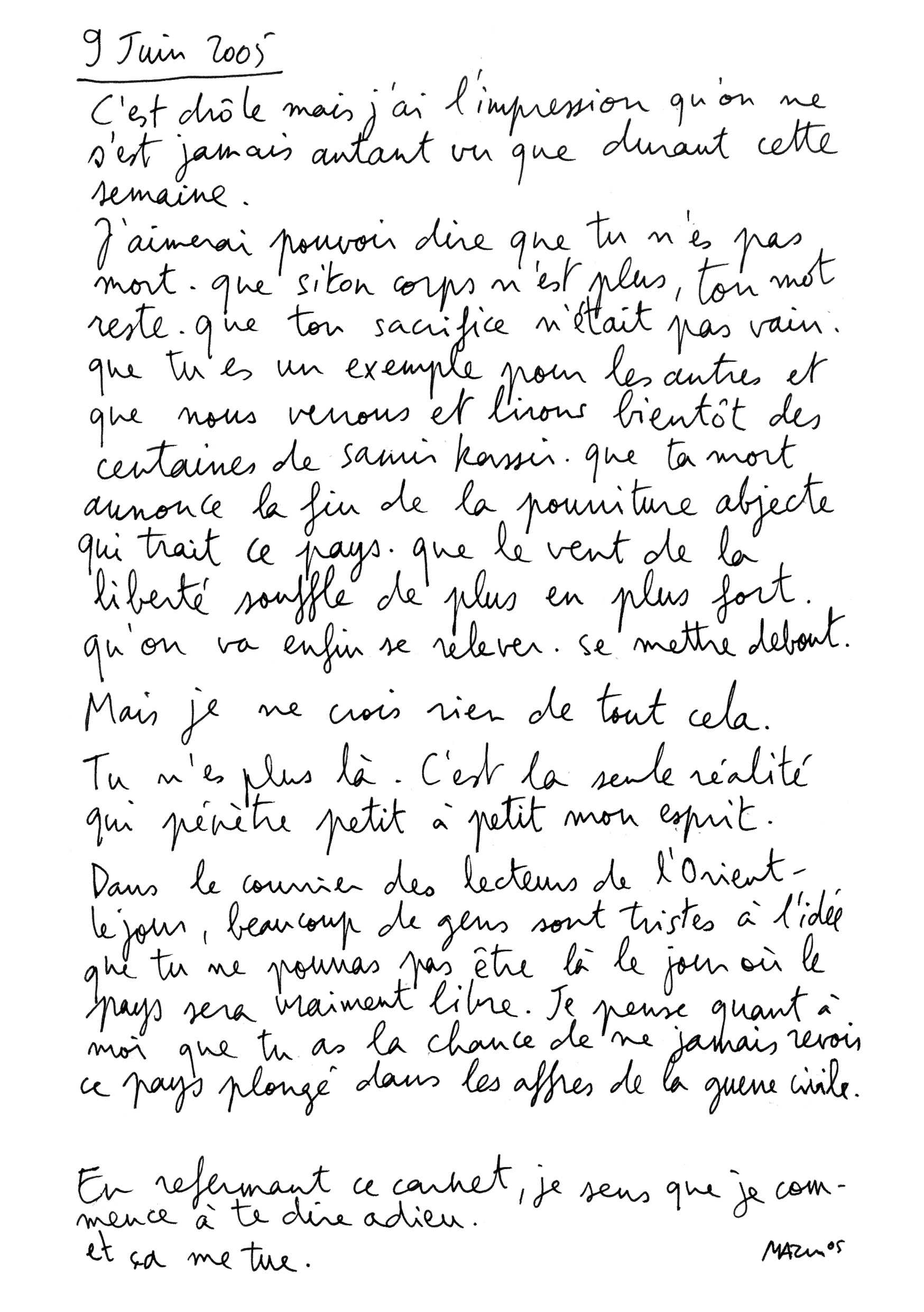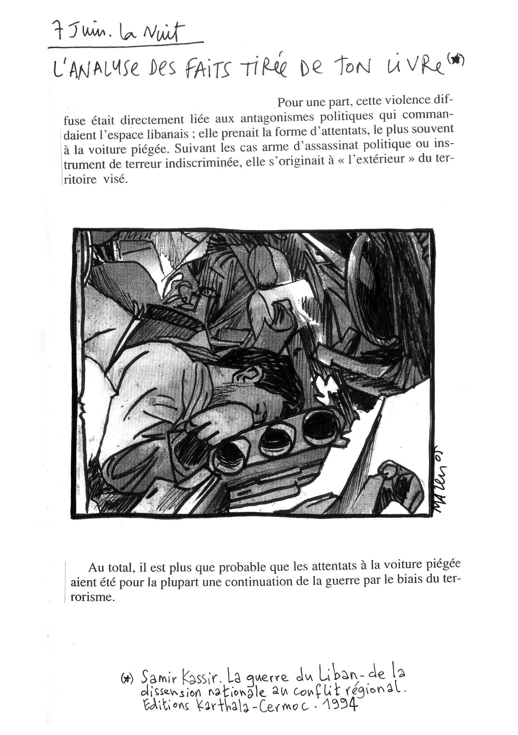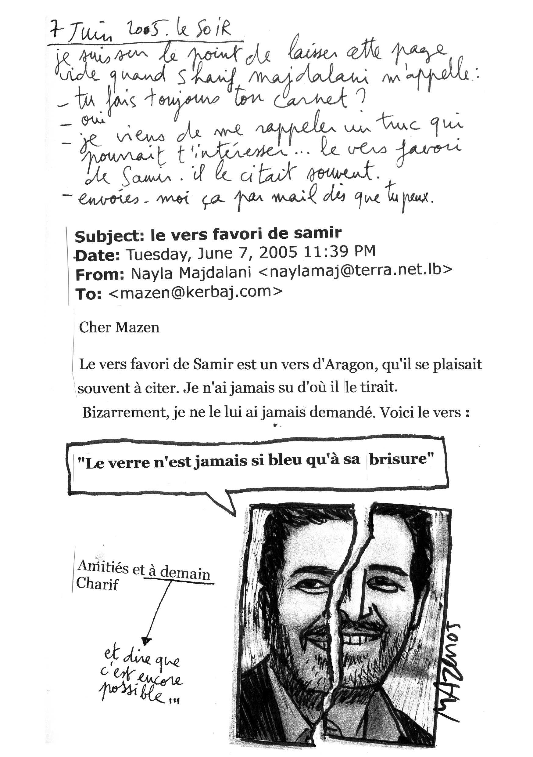 Une vingtaine de pages évoquant sa tristesse à l’aide de dessins, textes, coupures de journaux, extrait du livre de Samir Kassir, email.