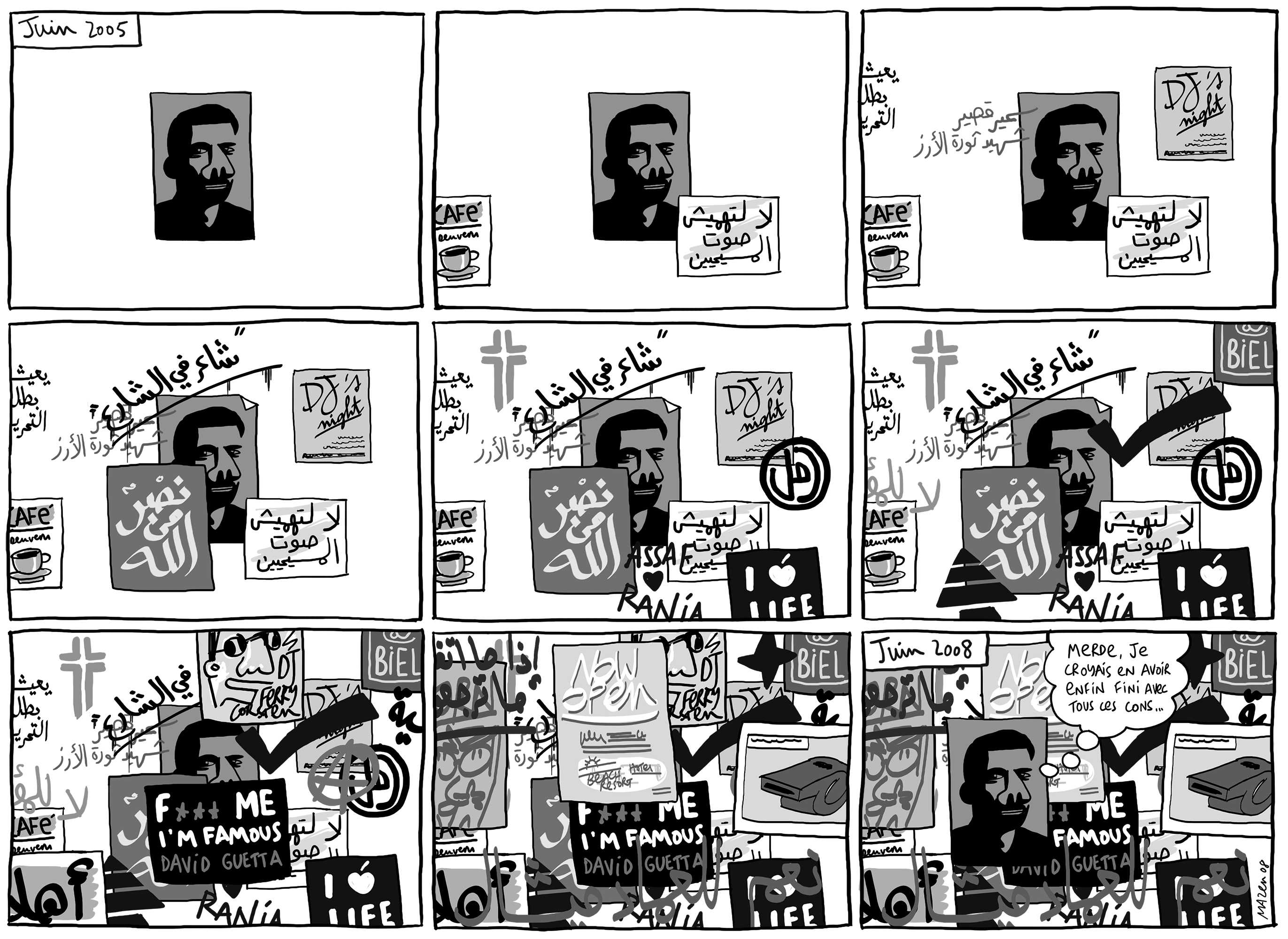 Ce n’est pas seulement la voix de Mazen que l’on entend dans ce court texte mais aussi celle de la plupart des jeunes Libanais qui ont vu dans ce meurtre tout un avenir s’écrouler. cette position de porte-voix de sa génération, Mazen Kerbaj la conservera dans plusieurs de ses œuvres. A partir de sa propre expérience, il est parvenu à reproduire un souffle commun à une certaine jeunesse.